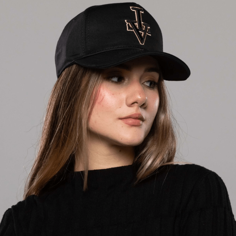 Gorra negra con logo bordado dorado. Diseño urbano con visera curva y ajuste cómodo. Envío gratis a toda Colombia.